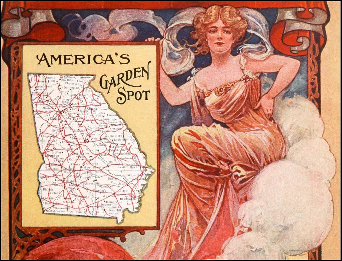 | What this railroad map lacks in precision, it makes up for in style. From: Georgia: The Empire State of the South. Agricultural Department, State of Georgia. Online at Internet Archive here. |
