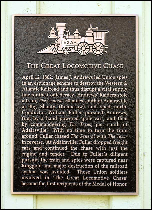 The depot at Adairsville, built around 1891, is listed on the National Register of Historic Places. It forms the centerpiece of the restored Bartow County town where, in 1862, the locomotive Texas began its chase of the General.
