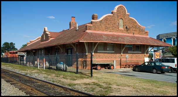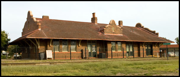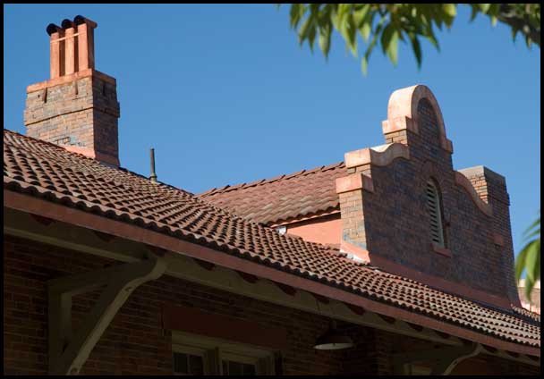 The depot's red roof tile, tall chimney pots, and curvilinear gables combine to create one of the most picturesque depot roofs in the state.