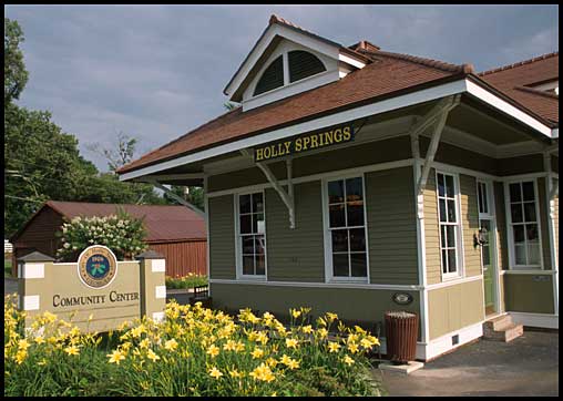 The 1914 Holly Springs depot served as City Hall for a time after L&N vacated it. Rehabbed in 1999 as the town's community center, the building continues to be a gathering place. The tracks are still active, serving trains of the shortline Georgia Northeastern Railroad.