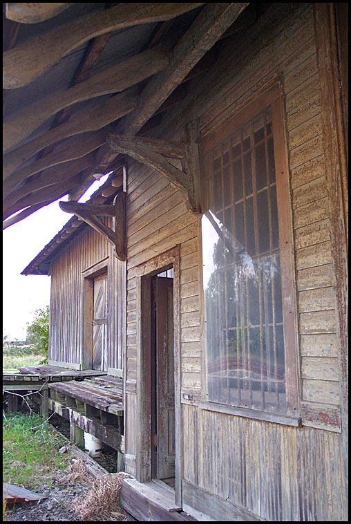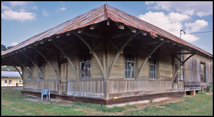This building at Lilly is readily recognizable as a former Atlanta, Birmingham & Atlantic Railroad depot by its extra-wide eaves supported by extraordinarily long curving brackets. Other AB&A depots can be seen at Ideal and Andersonville. Tifton has two, one of its own and also one from Montezuma that was moved to the Georgia Museum of Agriculture back in the 1970s.