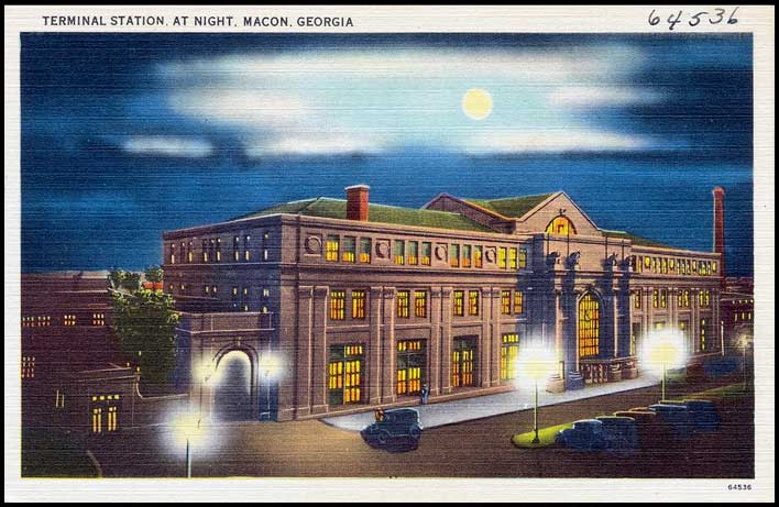 Macon's 1916 Terminal Station, at the foot of Cherry Street downtown, is Georgia's grandest surviving railroad station. It was designed in the Beaux Arts style by architect Alfred Fellheimer (1875-1959), who with his partners also designed stations in Cincinnati, Buffalo, and other cities.