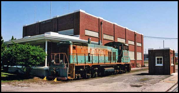 A St. Marys Railroad diesel locomotive sits beside the depot/shop building in St. Marys. Behind it is the former Gilman paper mill.