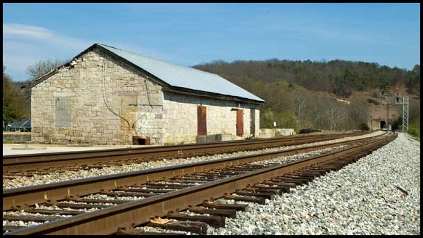 Down the tracks is the 1850 tunnel, the oldest railroad tunnel in the southeastern US. Beside it, a newer tunnel handles the heavy traffic of CSX's Atlanta-Chattanooga line.