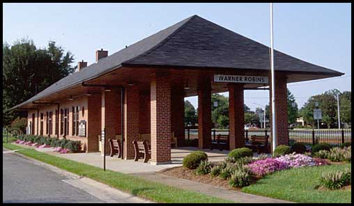 (Photo by Chris Little) Warner Robins' Georgia Southern & Florida depot was built in 1943-44 when the place was known as Wellston. The railroad closed the depot in 1970; it is now the E. L. Greenway welcome center. A few dozen yards to the north is the former Elberta depot, moved to here a few years ago from the Houston County fairgrounds. The ca. 1918 structure will soon be rehabilitated for use as a heritage center. This red brick Warner Robins depot replaced a smaller depot that was moved down Watson Boulevard and remodeled for the city's First Presbyterian Church.