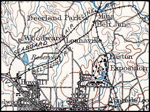The next belt line to arrive on the scene was the 8-mile Seaboard Air-Line Belt Railway, which was a connection between Howell and a point on the Georgia Carolina & Northern Railway (later merged into Seaboard) that was also called, confusingly , Belt Junction.* Chartered July 22,1892 and opened in March 1893, it made a long arc across the northern part of the city. Along its western section it ran parallel to, and north of, the earlier Georgia Pacific belt line. (See northside map.)