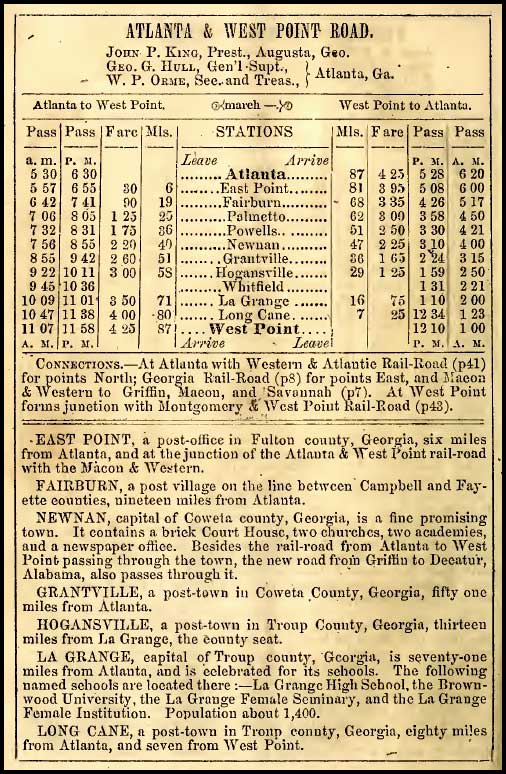 | From Hill & Swayze's Confederate States Rail-Road & Steam-Boat Guide. The dates for the timetables in this book are not clear because no year is indicated on them. A registration date of 1862 is on the book cover, and an 1863 calendar is included in the book. On page 21 is a reference to the Battle of Goldsboro Bridge, in North Carolina, which took place on December 17, 1862. For these reasons, an 1863 date for the timetables is given here. The entire book is online at Internet Archive here. |