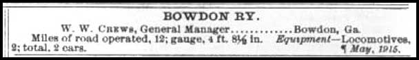 Within a few years after the first Bowdon Railway trains rolled into town, a connection in the opposite direction came under consideration. According to the December 1, 1916 issue of Railway Age Gazette, the railroad was comtemplating a 30-mile extension southwest to Roanoke in Randolph County, Alabama, through which the Atlanta, Birmingham & Atlantic had established its Manchester, Georgia, to Birmingham line in 1907. Bowdon Railway president J. L. Lovvorn was a native of Randolph County, but that probably was not as important to him as the leverage and benefits that his little railroad would gain through a connection to a second railroad, especially one not controlled by the Central of Georgia. Also, Roanoke was the nearest place that could offer a southern rail connection.