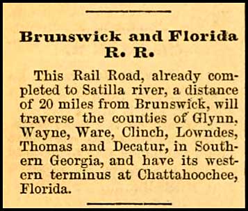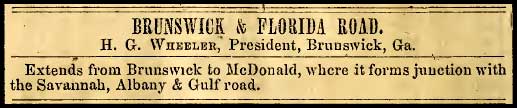 The Brunswick & Florida was chartered in 1835 to open up southern Georgia and northern Florida to the port of Brunswick by building a rail line to Chattahoochee, FL. Progress was slow, however, and by 1858-59 the line was completed only from Brunswick to a connection with the Atlantic & Gulf Railroad at Glenmore.