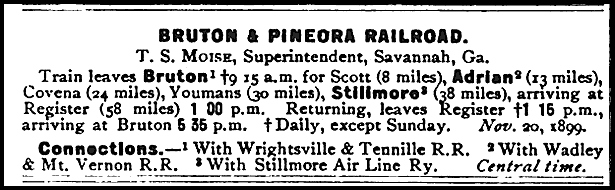 The western end of the line was the Laurens County town of Bruton and the projected eastern terminus was to be Pineora, a small community in Effingham County on the Central’s main line. (In 1895 Bruton was renamed, or re-spelled, Brewton.)