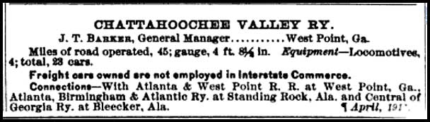 The 1921 issue of Poors Manual of Railroads indicated that the company had 5 locomotives, 6 passenger cars, 2 box cars, 4 flat cars, and 2 cabooses. A somewhat different report in the 1920 McGraw Transit Directory noted that the Chattahoochee Valley Railway operated storage battery cars from West Point to Standing Rock and Bleeker, summarizing the equipment as 2 motor passenger cars, 5 trailing passenger cars, and 12 freight cars.