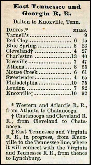 The ET&G was organized in 1848 from the financial wreckage. In 1856, it completed the line from Knoxville to the W&A at Dalton, Georgia, finally linking eastern Tennessee to the Atlantic coast. In 1869 it was merged with the East Tennessee & Virginia (Knoxville to Bristol) to form the East Tennessee, Virginia, & Georgia Railroad.