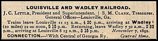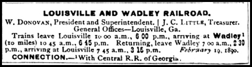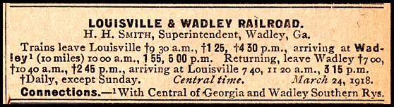 Incorporated in 1872, the 10-mile Louisville & Wadley Railroad opened in October 1879. It ran from Louisville, the county seat of Jefferson County, to Wadley, on the main stem of the Central of Georgia Railway.