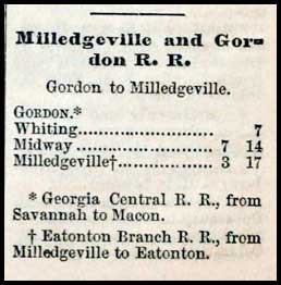 The Milledgeville & Gordon, one of the state's earliest railroads, was chartered in 1837 and was opened in 1852. The 17-mile line connected Milledgeville, then the state capital, with the main line of the Central of Georgia at Gordon. Soon after completion, the M&G acquired a northern connection to Eatonton when the Eatonton Branch Railroad opened for business.