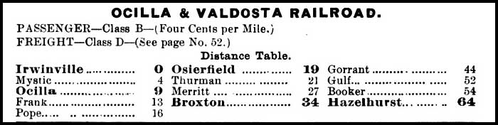 The Ocilla & Valdosta was chartered in 1903 to build a railroad from Macon to Valdosta. By 1906, the O&V had completed a line from Broxton to Ocilla and was constructing a line from Ocilla to Fitzgerald. It had acquired a Broxton-to-Hazlehurst line in a 1905 agreement with the Broxton, Hazlehurst & Savannah Railroad and had begun steps to absorb the Fitzgerald, Ocmulgee & Red Bluff Railway, but the company had gotten into a difficult financial situation.