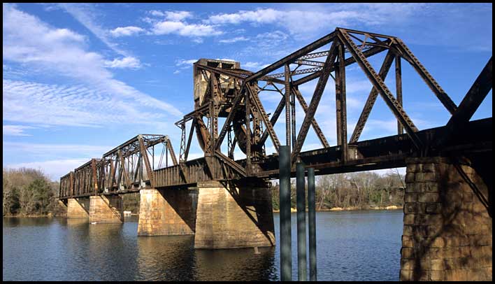 | This bascule bridge carries Norfolk Southern trains from South Carolina into downtown Augusta (where they travel down the middle of Sixth Street to connect with other lines). Built for Southern Railway in 1912, it has a 101-foot lift span designed by the Scherzer Rolling Lift Bridge Company of Chicago.
