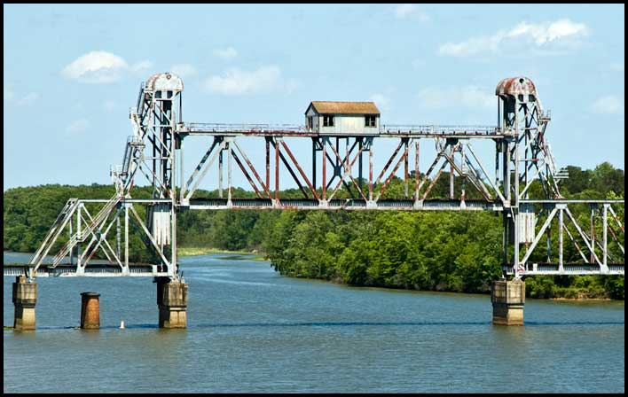 | Swing bridges move horizontally rather than vertically. Pivoting atop a pier, the span can "swing" away from the navigation channel, allowing a boat to pass with no vertical obstruction. This bridge is over the Ocmulgee River at Lumber City, between Macon and Brunswick. |