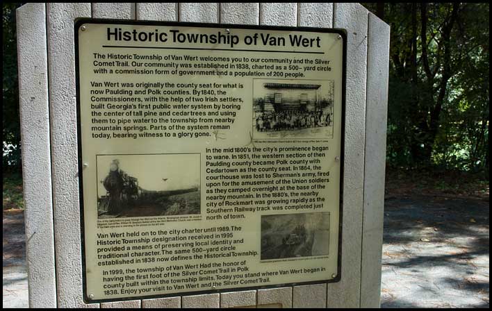 | On the east side of Rockmart, the trail passes through Van Wert, which was the county seat of Paulding County before Polk County was carved from it. The former town was also the intended destination of the post-Civil War Cartersville & Van Wert Railroad. (Click here to enlarge). |