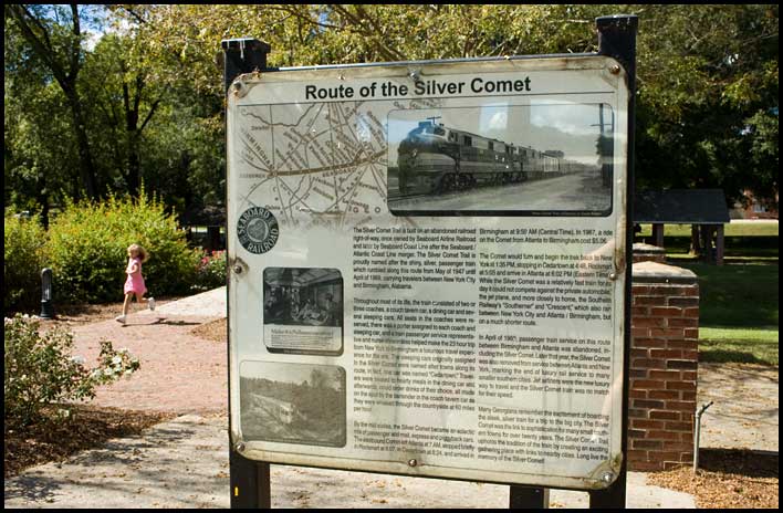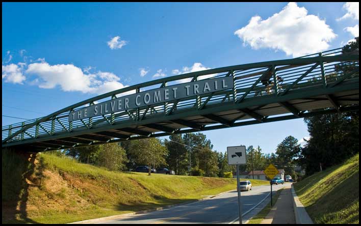 While Georgia has lagged behind many other states in converting abandoned rail corridors to long multi-use trails, we do have one star in that regard. The old Atlanta-Birmingham route of Seaboard Air Line Railway now provides a 61-mile linear park across Cobb, Paulding, and Polk counties to the state line. Once in Alabama, the trail becomes the Chief Ladiga Trail, continuing on the old Seaboard route to a point west of Piedmont, where it joins an abandoned Southern Railway (originally Selma, Rome & Dalton) route to Weaver, on the north side of Anniston. Georgia's trail was named for a streamlined passenger train that traversed the route from 1947 to 1969. |