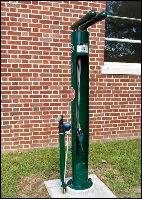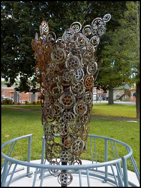 | An artistic celebration of pedal power stands at the trailhead in downtown Rockmart. A circular bike rack surrounds it. |