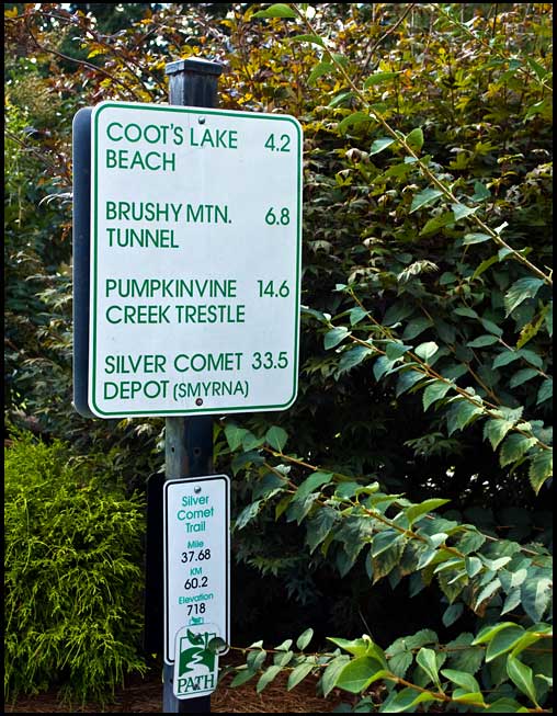 To the east, between Rockmart and Powder Springs, Norfolk Southern's Rome-Atlanta line closely parallels the trail, passing under it between Dallas and Hiram. NS trains can often be heard even when they can't be seen, adding a bit of appropriate horn music to the railfan's bike ride. While the eastern end of the trail is curently at Mavel Road in Cobb County, the abandoned rail bed actually extends another three miles to the Chattahoochee River. A recently established "Connect the Comet" group is advocating extension of the trail to the river, along with a possible connection to the new Atlanta Beltline trail system. |