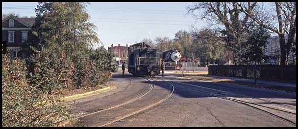 | Norfolk Southern no. 2312, the "River Street Rambler," travels on Savannah's River Street on December 31, 1997. Photo by Russell Ottens. |