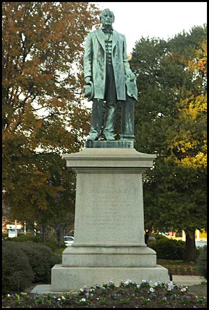 At the intersection of Third and Mulberry Streets in downtown Macon stands this statue of William Morrill Wadley, president of the Central of Georgia from January 1866 to August 1882. Wadley took a railroad that had seen 170 miles of track destroyed by war and returned it to prosperity. As railroad historian Maury Klein said, "The restoration of the Central and the guiding of its destiny through the difficult postwar years became his lifework. Though his achievement was not without its shortcomings, he succeeded in making the Central the most powerful corporation in Georgia and one of the finest railroad properties in the South."* The bronze statue was the work of New York sculptor Robert Cushing. It was unveiled on June 18, 1885. The inscription on the base reads: William M. Wadley * Maury Klein. The Great Richmond Terminal; A Study in Businessmen and Business Strategy. Charlottesville: University Press of Virginia, 1970. |