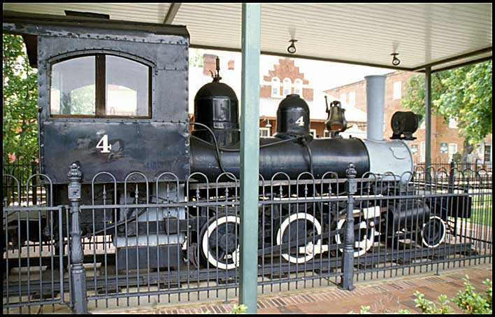 This narrow-gauge (36-inch) 2-6-0 locomotive, built in 1916 by Glover Machine Works of Marietta, sits across the tracks from Marietta’s old passenger depot. Constructed as Glover No. 81421, it was sold to the Coulbourn Bros. Lumber Company of Suffolk, Virginia, which operated it as No. 4. In 1923 it was returned to Glover. It was restored in 1991-92. In the 1990s, much of the Glover locomotive-building tools and equipment, along with unfinished locomotives, various parts, and company records were moved to the Southern Museum of Civil War and Locomotive History at nearby Kennesaw. There they have been assembled into a reproduction of the Glover factory, forming one of the museum's principal exhibits. |