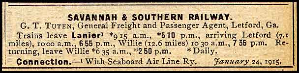 On September 20, 1909, the Savannah and Southern was chartered to build a railroad from Savannah to the Altamaha River, a navigable waterway about 50 miles distant.