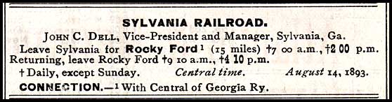 The Sylvania Railroad Company was chartered January 3, 1884. The 15-mile line, which ran from Sylvania to the Central of Georgia at Rocky Ford, was complete by April of 1885. The Central provided much of the construction material for the line and held a mortgage on it.