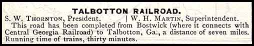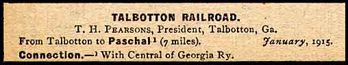 Talbotton RailroadAlthough chartered on August 23, 1872, the 7-mile Talbotton Railroad was not opened until May 4, 1881. An infusion of funds from the Central of Georgia finally completed the line, but in return the Talbotton’s owners had to turn over a majority of their stock to the Central. The line connected Talbotton with the Southwestern Railroad at Bostick (later renamed Paschal, now Junction City). In the 1889 edition of The Official Railway List, the Talbotton Railroad reported operating 1 locomotive, 1 passenger car, and 4 freight and miscellaneous cars. In the 1894 List it was 3 locomotives, 2 passenger cars, and 5 freight and miscellaneous cars. In 1906 the new Atlanta, Birmingham and Atlantic Railroad was built a short distance west of and parallel to the Talbotton Railroad. The AB&A had combined existing lines in south Georgia with extensive new construction to create a major rail line from the Georgia coast to Birmingham, with a branch to Atlanta. The Talbotton Railroad was abandoned in 1957.