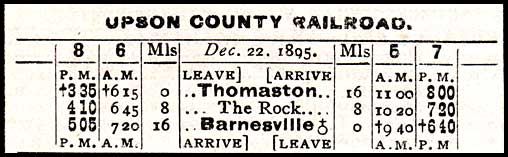 The 16-mile line from Thomaston to Barnesville was built by the Thomaston & Barnesville Railroad. Although the company had been chartered in 1839, the line did not open until 1856. It was reorganized as the Upson County Railroad in 1860.