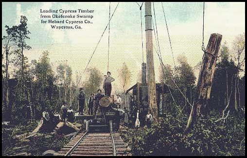 From Hopkins, the rails continued into the swamp as a tramroad running to (in order) Cravens Hammock, Mixons Hammock, The Pocket (now Stephen Foster State Park), Billys Island (at the height of the logging operations in the swamp some 600 people lived on Billys Island), and Floyds Island. Additional tram lines branched off this central spine.