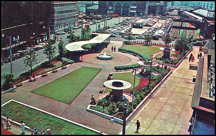 | This mid-20th century view shows the same area as the photo above it, but the station has been demolished and the streets have been elevated. The Kimball House is in the upper left corner (too dark to see details); an elevated parking deck occupies the station site; and the elevated Plaza Park stands over the railroad tracks. Its three mushroom-shaped canopies were built around vents for steam locomotive smoke.