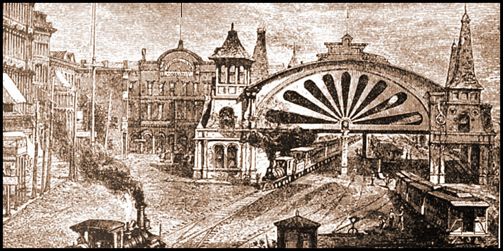 | The six-story building on the left is the first Kimball House hotel. It burned in 1883 but was soon replaced. Behind the station is the three-story Markham House hotel. (See Hotels at the Depot). |
