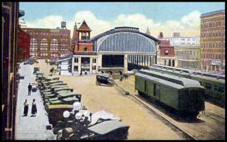 | The autos in this photo are parked along Wall Street beside the Kimball House. The station has lost a corner steeple. |