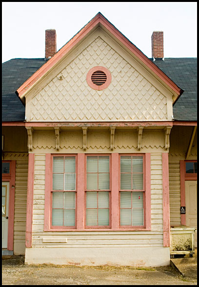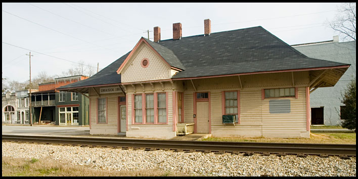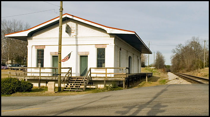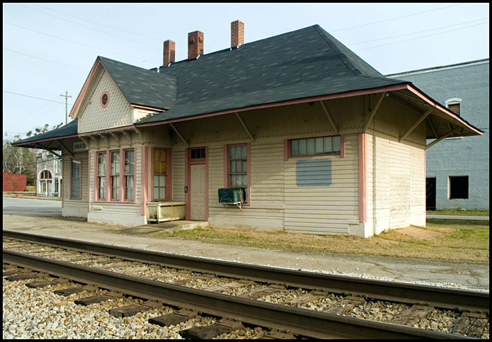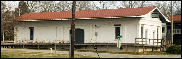 The Grantville passenger depot stands alongside the former Atlanta & West Point Railroad, now the Atlanta-Montgomery line of CSX. It currently houses the Coweta County Genealogical Society and Historical Research Center.