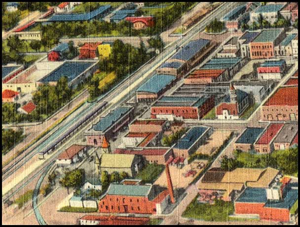 | In this old postcard view, Union Depot is just to the right of the covered rail platform. Crossing the tracks at the top of the image is Hill Street and the Griffin Grocery Co. building, now the Griffin Welcome Center. |