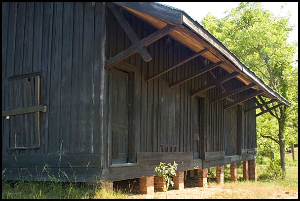 | The depot at Grovania stands vacant across the road from the tracks of the Georgia Southern & Florida Railroad (now part of Norfolk Southern). Like the Arabi depot further down the line to the south, it has a board-and-batten exterior and a wide overhang with simple support beams.