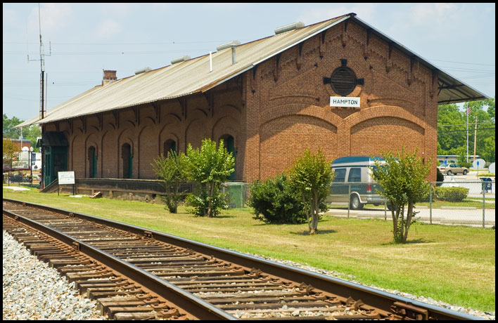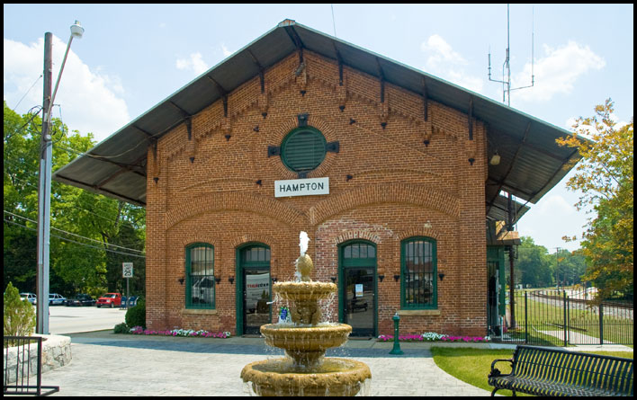 | Built in 1880-81, the Central of Georgia depot at Hampton is one of Georgia's finest examples of nineteenth-century railroad architecture. The substantial red brick structure, donated to the city in 1975, was long used for municipal offices and as a police station. It is now a community center and museum. |