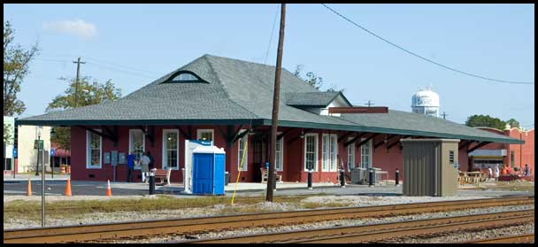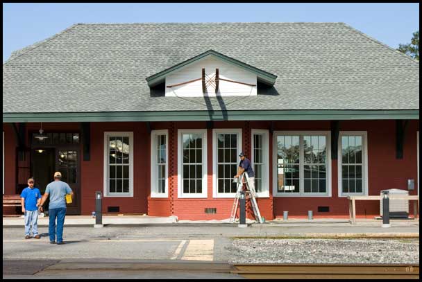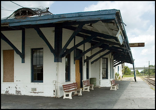 | Damaged by a February 2003 fire, the 1903 Atlantic Coast Line depot at Jesup stood closed and forlorn for a decade before rehabilitation began in early 2012. It was particularly uninviting for Amtrak passengers, who had been forced to wait outside even before the fire due to the structure's deterioration.