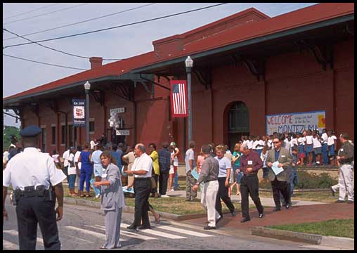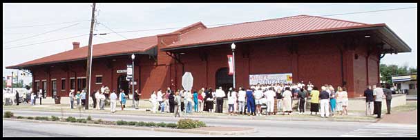| Above, state leaders on a multi-city tour of rehabilitated downtown buildings visit Montezuma's depot. |