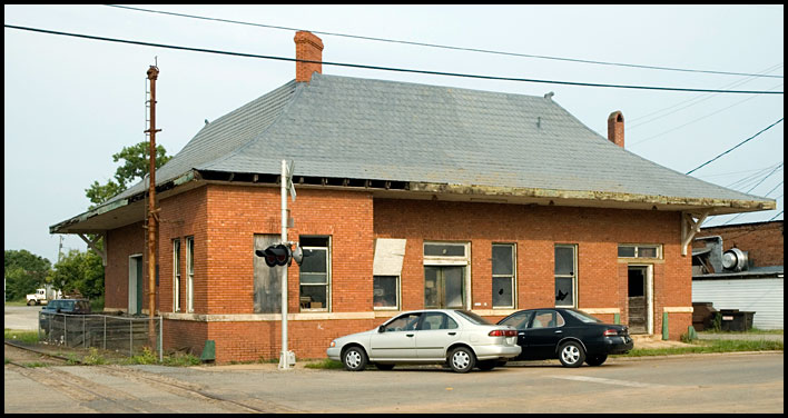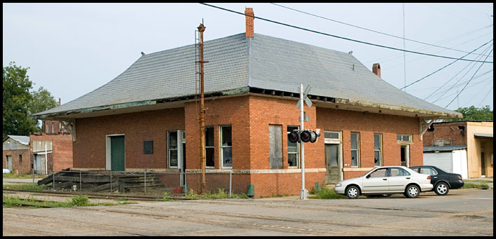 | With many broken windows, a collapsing freight platform, and a deteriorating roof, Rochelle's Seaboard Air Line Railway depot is in sad shape. Fortunately the structure was built well and could still be saved. |