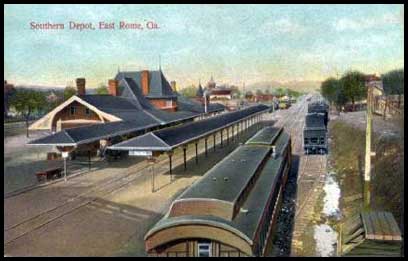 | Southern's passenger depot, which stood in East Rome on E. 6th St. between Maple and Walnut avenues, burned on November 15, 1974. Built in 1900, it replaced a depot constructed by the ETV&G sometime around 1884 that also burned, in 1899. A photo of the ETV&G depot is online at Georgia's Virtual Vault. |