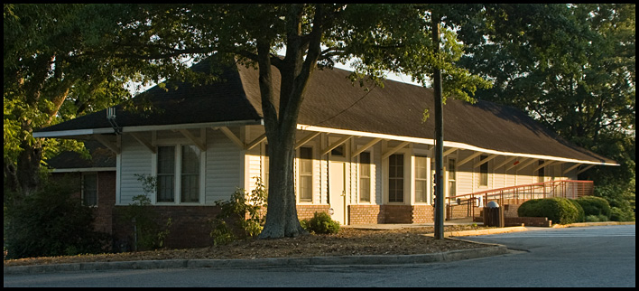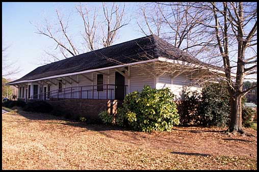 Shannon's Southern Railway depot was cut in two and moved to Mountain Park, an unincorporated Gwinnett County community near Stone Mountain, sometime around 1976. Today it stands as a community center in a county park at 5050 Five Forks Trickum Road. |