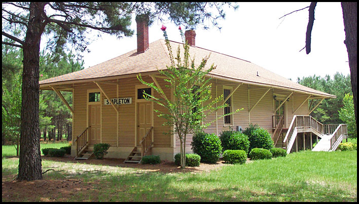 | The former Augusta Southern depot at Stapleton, built around 1885, is now a community center. It is located off Main Street and School Street at the east edge of town. The railroad here was abandoned in 1934. |