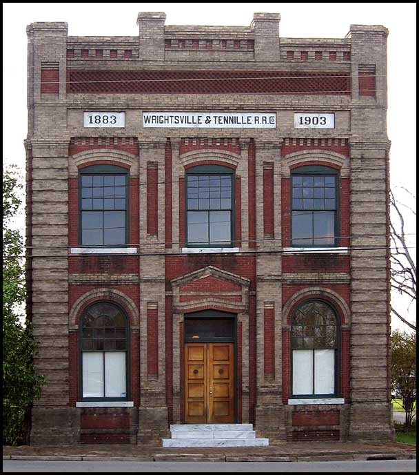| Across the street is the former headquarters of the Wrightsville & Tennille Railroad, which ran south from Tennille to Hawkinsville and Eastman. The building (below) is a 1903 structure designed by Charles E. Choate, an architect known for well-proportioned and beautifully detailed buildings in several Southern states. (121 W. South Central Avenue). |