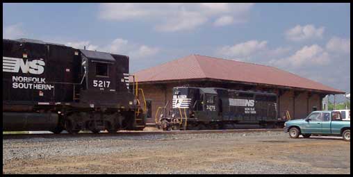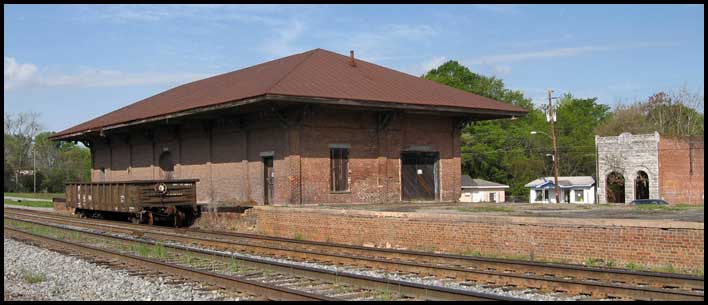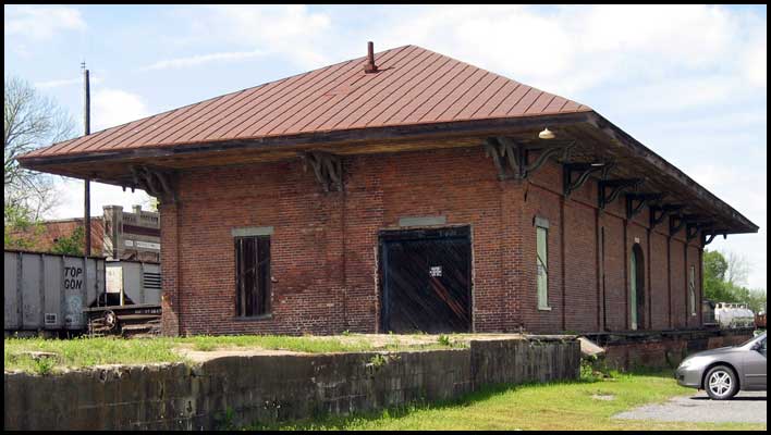 | Tennille's ancient brick depot was constructed by the Central of Georgia in 1869. Back then, bales of cotton were loaded aboard trains here; today kaolin is the local product brought to the mainline tracks. Washington County is the Kaolin Capital of the World. |