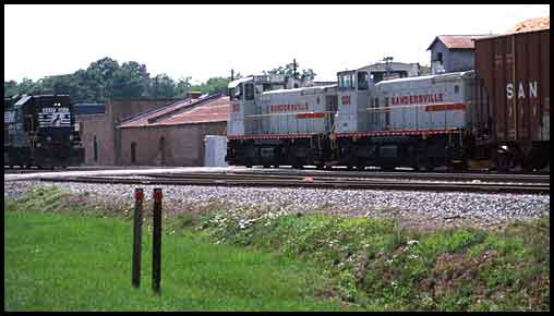 | The fine white clay, used in paper production and many other industrial processes, is hauled from area mines and processing plants by the Sandersville Railroad. At Tennille, the rail cars are switched to Norfolk Southern trains for shipment to further points. |