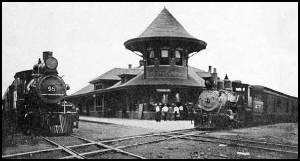 The city's Union Station (above) once stood on the south side of the railroad at Leader Street and Main Street (present westbound US 280). A separate freight depot stood to the east across Leader Street. (See 1913 Sanborn map.)